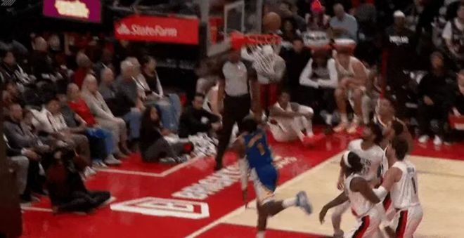 庫(kù)明加本場(chǎng)比賽被安排首發(fā)登場(chǎng)比賽,他在第二節(jié)比賽進(jìn)行到后半段還剩0.9秒時(shí)刻,庫(kù)明加突破上籃被干擾未能命中,反而是開(kāi)拓者成功打反擊得分。